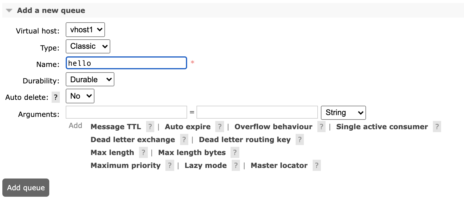 위 이미지처럼 큐의 이름을 정한 뒤 add queue 버튼을 클릭하면 queue가 생성됩니다.