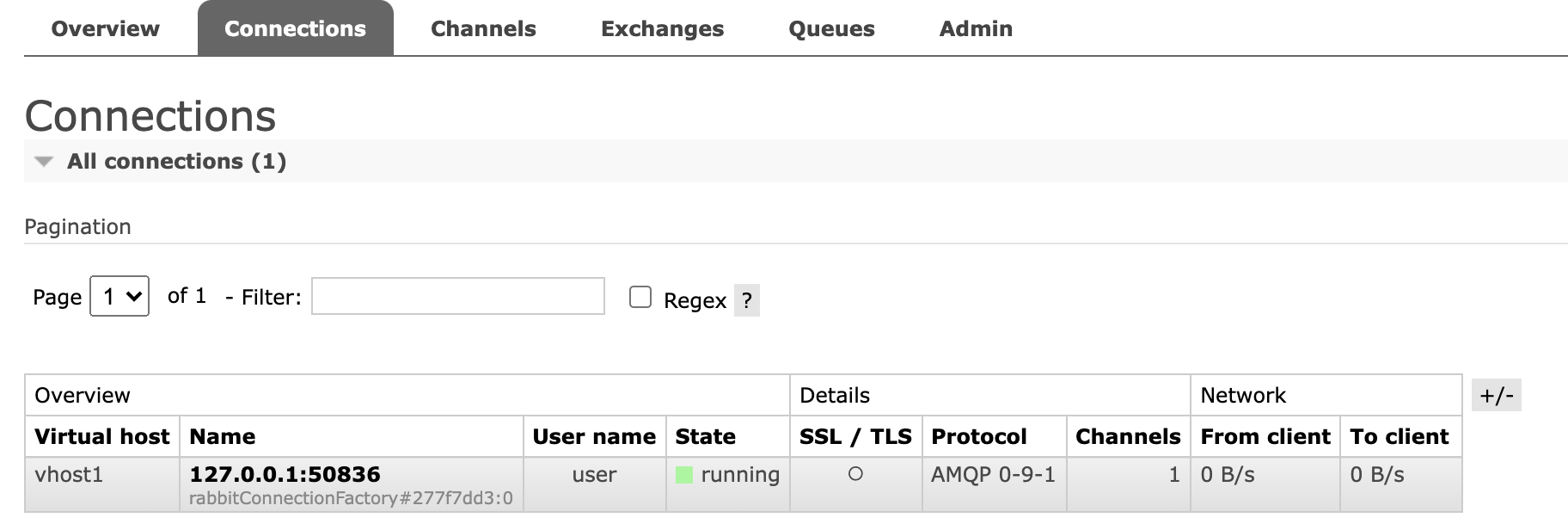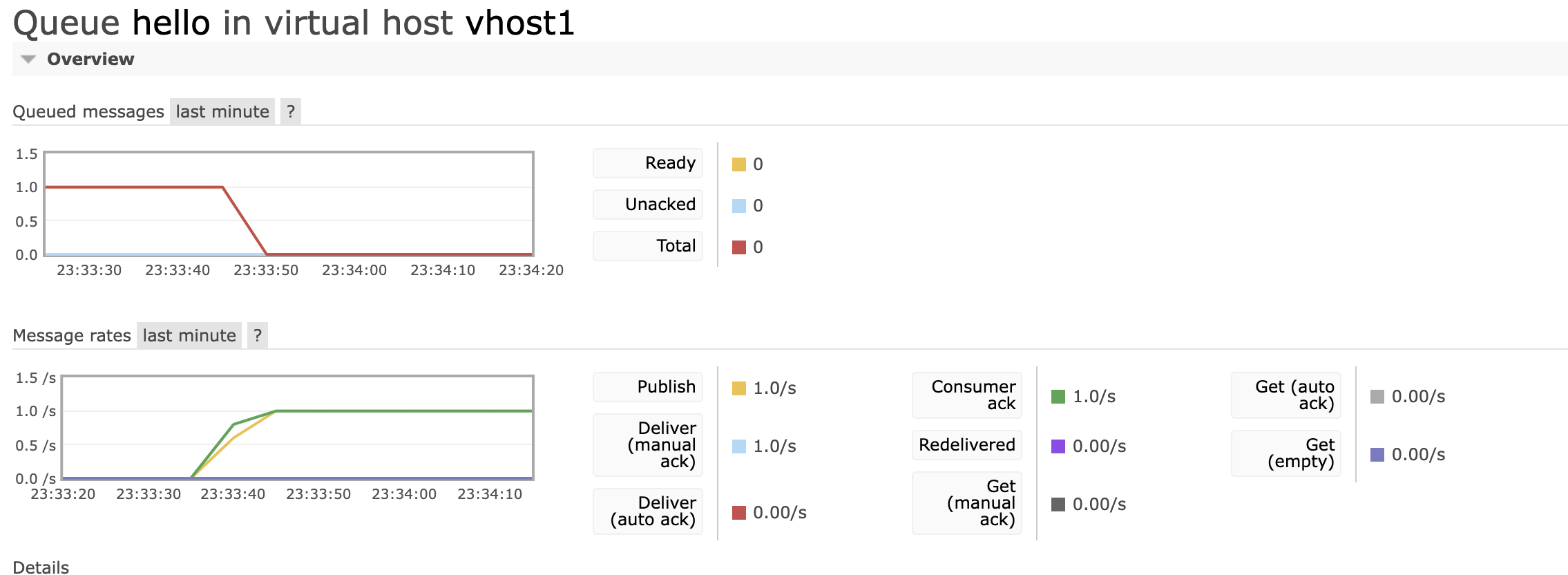 어플리케이션을 실행시킨 상태로 gui 관리 페이지에서 hello큐를 보면 초당 1개의 메시지가 publish 되는 것을 볼 수 있고 consumer가 소모하는 것을 알 수 있습니다.