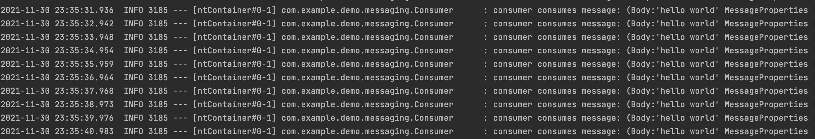그리고 메시지를 produce 하는 sendMessage 메서드에 @Scheduled 어노테이션을 추가했는데 이는 메시지를 1초 간격으로 큐로 전송하면서 컨슘되는 것을 확인하기 위함입니다.