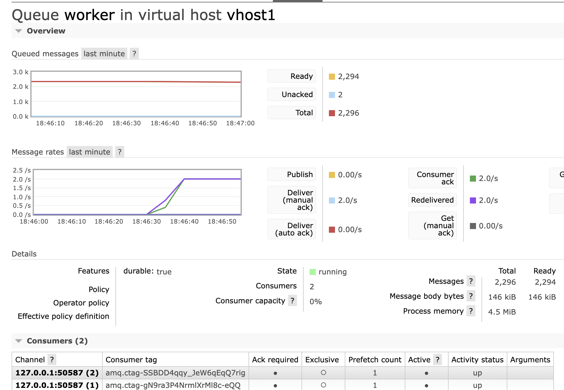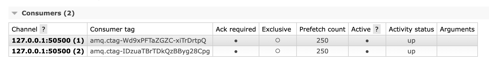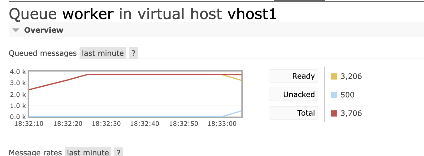 2개의 consumer가 연결되자 prefetch count 250 x 2가 되어 unacked된 메시지가 500개가 되는 것을 볼 수 있습니다.