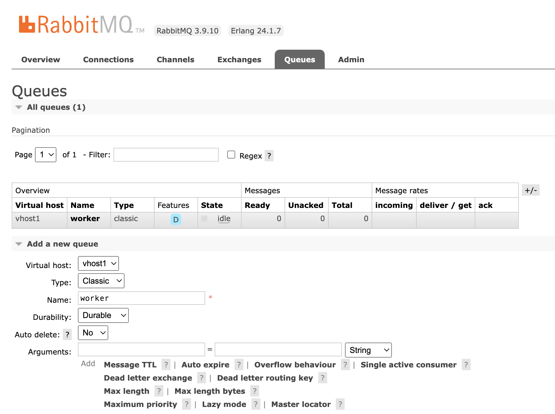 queue는 gui 페이지에서 등록했고 이름을 worker로 설정한 것 외에는 별도의 추가적인 설정은 없습니다.