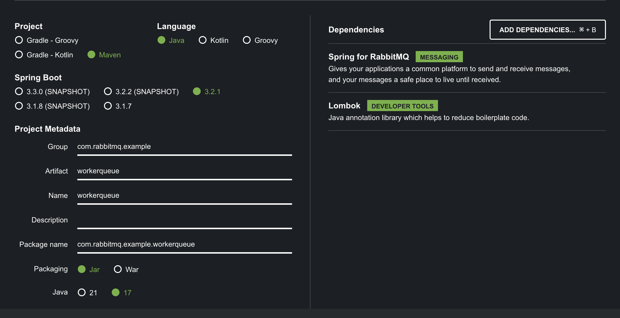 spring boot를 사용하고 의존성은 간단하게 lombok과 RabbitMq만 추가하도록 하겠습니다.